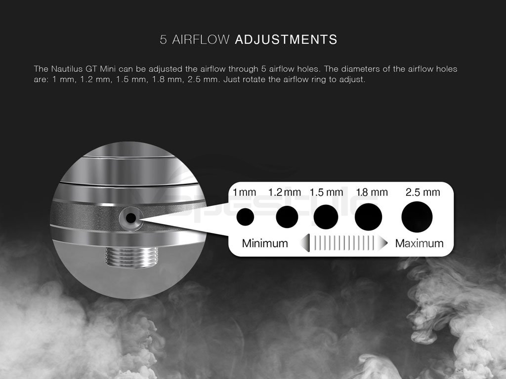 Dokonalé Airflow Nastavitelný přívod vzduchu (Airlow) je samozřejmostí, a to v dokonalém provedení, které je přesně odstupňované celkem pěti různě velikými průchody. Průchod vzduchu může být také celkově uzavřen. Díky tomu to provedení je Nautilus GT Mini primárně určen pro klasický styl potahování MTL, jaký známe u klasických cigaret, nicméně v kombinaci se správně zvolenou žhavící hlavou a při plném otevření přívodu vzduchu lze snadno použít i pro přímý styl potahování do plic (DL). |