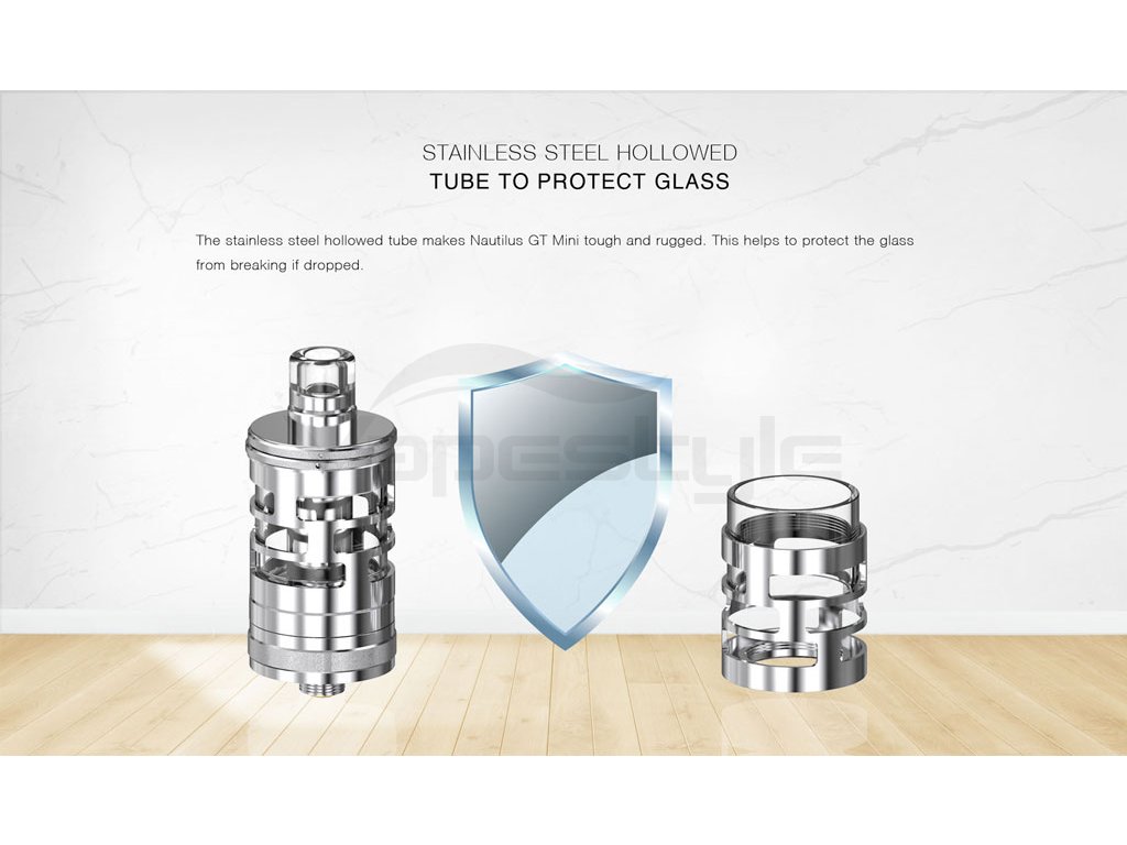 Kvalitní konstrukce Clearomizer aSpire Nautilus GT Mini je postaven na kvalitní základně z ušlechtilé oceli, která je doplněna o kvalitní pyrexové sklo. Celkový objem pro náplň tak činí až 2,8ml zásobního prostoru |