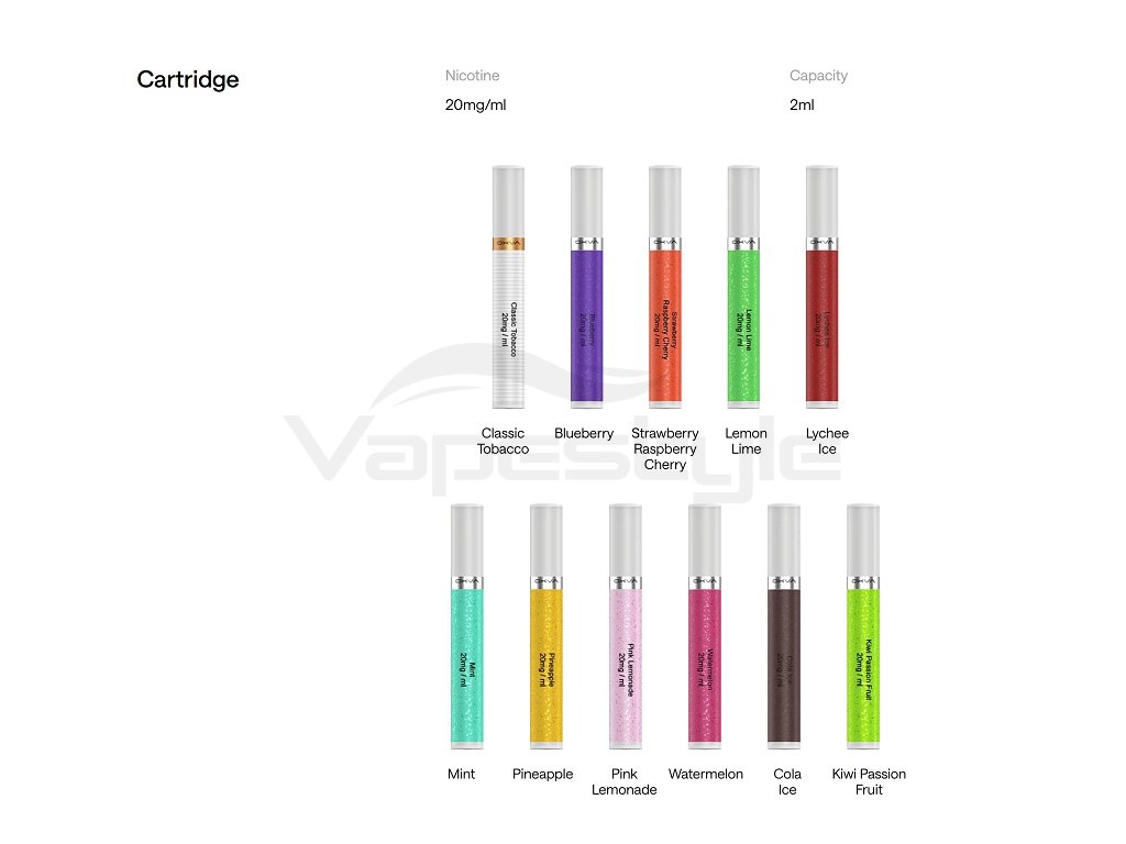 - Předplněné 2ml cartridge s e-liquidem 20mg/ml