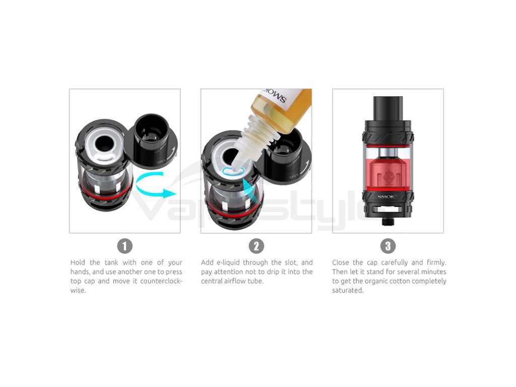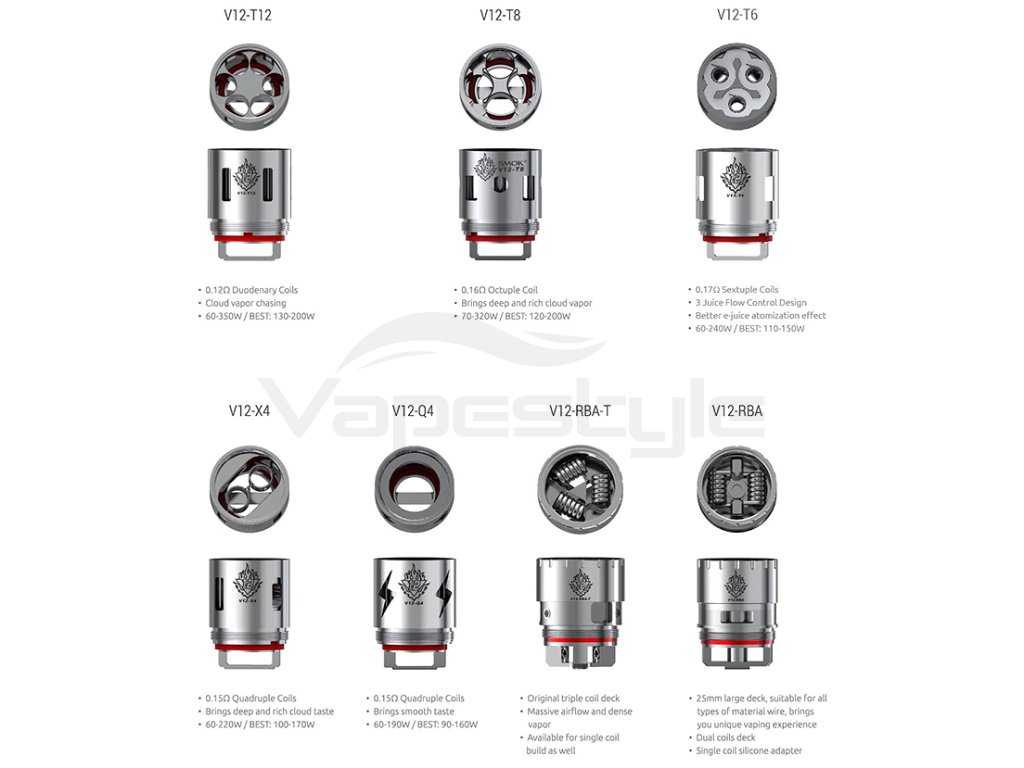 Clearomizer Smoktech s označením TFV12 je opravdovým výrobníkem mračna, který se díky novým žhavicím hlavám zaměřuje především na vysokovýkonná zařízení. Využívá systém horní plnění bez jakéhokoliv šroubování (po pootočení horní části plníte otvorem přímo do těla clearomizeru) o objemu 6ml. Pro dosažení maximální tvorby páry došlo ke zvětšení spodního přívodu vzduchu a kouřovodu. Nejpodstatnější záležitostí každého dobrého clearomizeru jsou žhavicí hlavy a ty u TFV12 neznají konkurence. V této sadě nalezneme dvě čtyřspirálkové žhavicí hlavy V12-X4 a V12-Q4 o odporu 0,15ohm a především V12-T12, což je dvanáctispirálková hlava o odporu 0,12ohm, která zvládne pracovat od 60W do 350W.