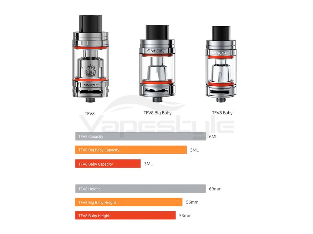 Clearomizer Smoktech TFV8 Big Baby vychází z velmi oblíbeného původního modelu TFV8 Baby. Jeho kapacita objemu pro e-liquid narostla na velmi slušných 5ml. TFV8 Využívá horní plnění e-liquidem, kde není nutné nic odšroubovat, protože horní uzávěr jednoduše pootočíte a plníte rovnou do těla Clearomizeru.