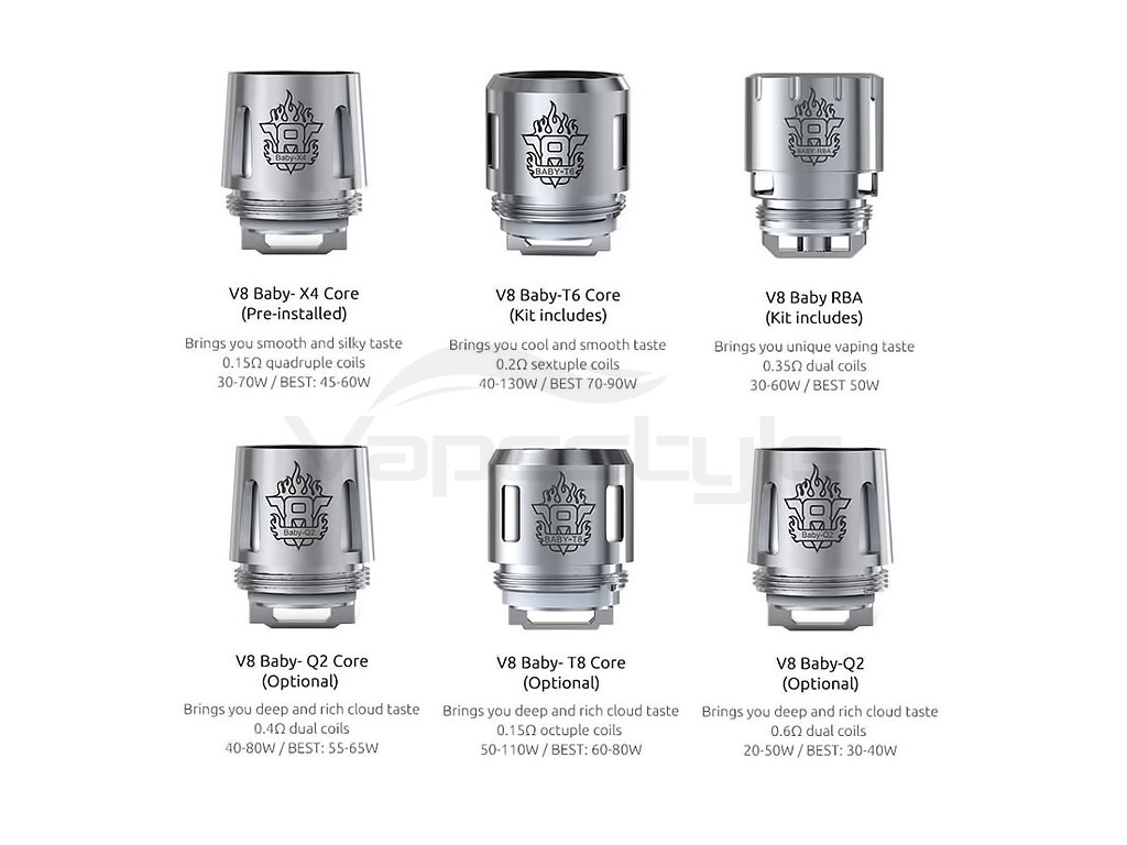 TFV8 využívá zcela nové žhavicí hlavy s typovým označením V8 Baby, které Vás jistě překvapí velkým výběrem odporů a také počtem použitých spirálek.