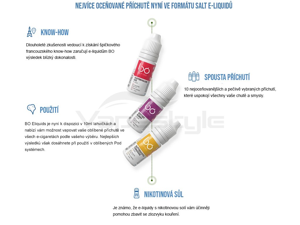 Hříšná směs, elegantní bohatost charakteristická pro tradiční virginský tabák, smíchaný s lehkým nádechem sladkého karamelu. E-liquid s nikotinovou solí francouzského výrobce BO Vaping a poměrem PG 50%, VG 50%.