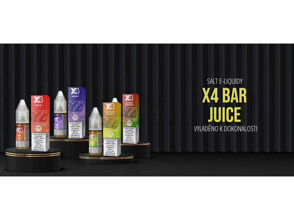 Hlavní předností náplní do elektronických cigaret značky X4 Bar Juice je to, že obsahují dnes velmi oblíbenou nikotinovou sůl (Nic.Salt) a jejich neskutečně věrné podání chuti, což přináší ještě hlubší požitek z vapování. Každá jednotlivá příchuť je pečlivě propracovávána do posledního detailu, dokud není dosaženo požadované věrnosti. E-liquidy X4 Bar Juice přichází v mnoha dokonale vyladěných příchutí, což ocení hlavně vyznavači ovocných, či nápojových příchutí.