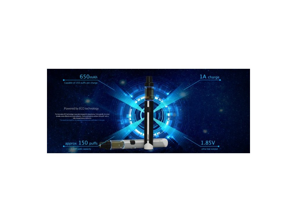 Joyetech představuje nového člena do své ALL in ONE rodiny. AIO ECO je rozměrově nejmenším modelem této řady, avšak vestavěná baterie o kapacitě 650mAh s konstantním napětím 1,85V Vám zaručí až 350 potahů na jedno nabití. Nové žhavicí hlavy BFHN o odporu 0,5ohm jsou zkonstruované i pro náplně s vyšším obsahem nikotinu což ocení především silnější kuřáci. Používá systém horního plnění - po odšroubování vrchní části plníte liquid přímo do těla nádržky o objemu 1,2ml. Clearomizer je podsvícen LED diodami, které slouží i jako indikátor stavu nabití. Rychlé nabíjení zajišťuje 1A micro USB kabel.