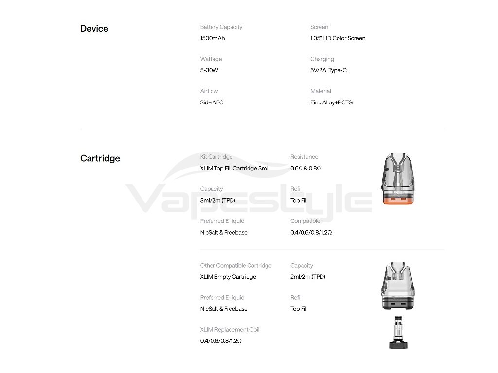 Špičkové Pod CartridgeXLIM V3 top-fill pody s kapacitou 3 ml (TPD verze 2 ml) nabízejí pohodlné plnění za pouhé 3 sekundy pomocí bezpečného bočního uzávěru bez nutnosti vyjmutí podu ze zařízení. Pody jsou vyrobeny z odolného PCTG materiálu s průhledným designem. Plná kompatibilita se všemi XLIM pody včetně V2, V3 a EZ Pod Cartridgí. |
