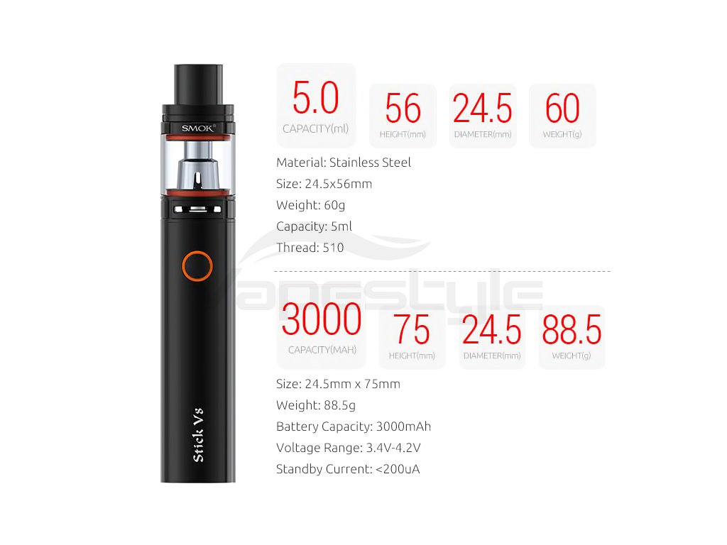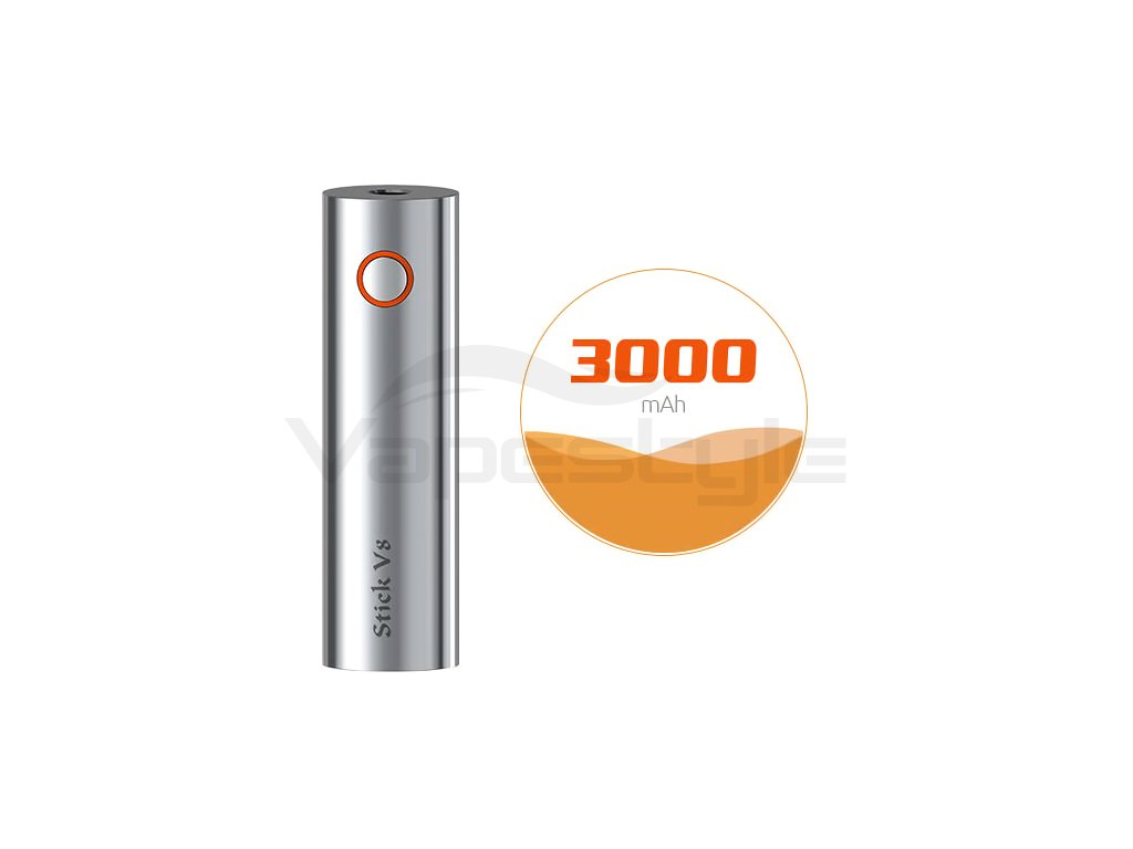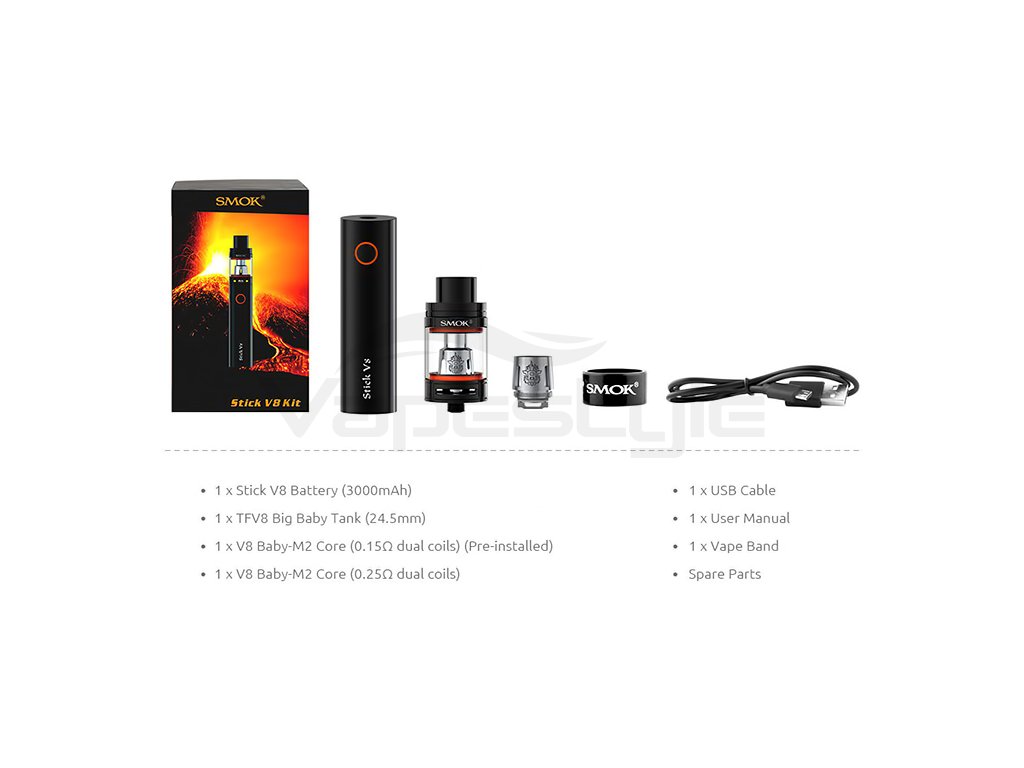 Smoktech Stick V8 se vyznačuje svojí jedinečnou kouřivostí a to díky propojení nové velkokapacitní baterie Stick V8 s clearomizerem TFV8 Big Baby. Vestavěná baterie o kapacitě 3000mAh s 20A vybíjecího proudu potěší i toho nejnáročnějšího uživatele. Nabíjení umožňuje micro USB vstup. Clearomizer TFV8 Big Baby vychází z původního modelu, avšak jeho kapacita narostla na úctihodných 5ml. Využívá horní plnění bez jakéhokoliv šroubování...po pootočení horní části plníte otvorem přímo do těla clearomizeru (viz foto v příloze). Celý clearomizer je vyroben z nerez oceli a Pyrexu (laboratorní sklo). Regulace přívodu vzduchu se nachází v dolní části základny = ještě lepší kouřivost. Jako žhavicí hlavy využívá řadu V8 Baby, které Vás překvapí velkým výběrem odporů a počtem použitých spirálek. U této sady se navíc můžeme setkat s novou žhavicí hlavou M2 pro přímé potahování do plic.
