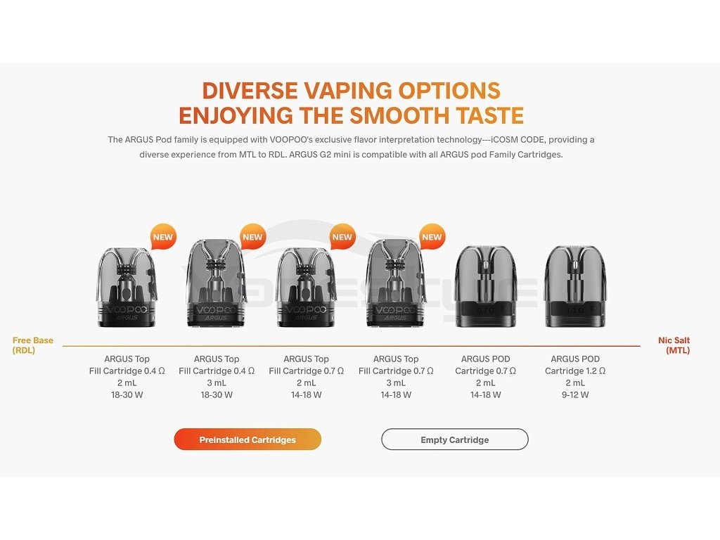 Tento model je vybaven inovativním systémem Pod Cartridgí, které umožňují snadnou výměnu žhavících hlav a rychlé doplňování e-liquidu. Součástí balení je nejnovější Argus Top Fill Cartridge V2 s revoluční technologií iCOSM Code 2.0, která kombinuje tři klíčové inovace pro dokonalý vapingový zážitek: Liquid-Seal Shield (měděný obal kolem spirálky zvyšující uzamčení oleje o 83 % a zaručující 30denní ochranu proti úniku), Mega-Core (zajišťuje okamžité nasycení a konzistentní tok e-liquidu pro rovnoměrnou chuť) a Golden Cotton (vyrobená z leteckých materiálů, odolává teplotám až 260 °C, prodlužuje životnost spirálky o 300 % a umožňuje spotřebovat až 100 ml e-liquidu bez ztráty chuti). Díky svému minimalistickému designu a široké paletě barev se stane stylovým doplňkem každého vapera.