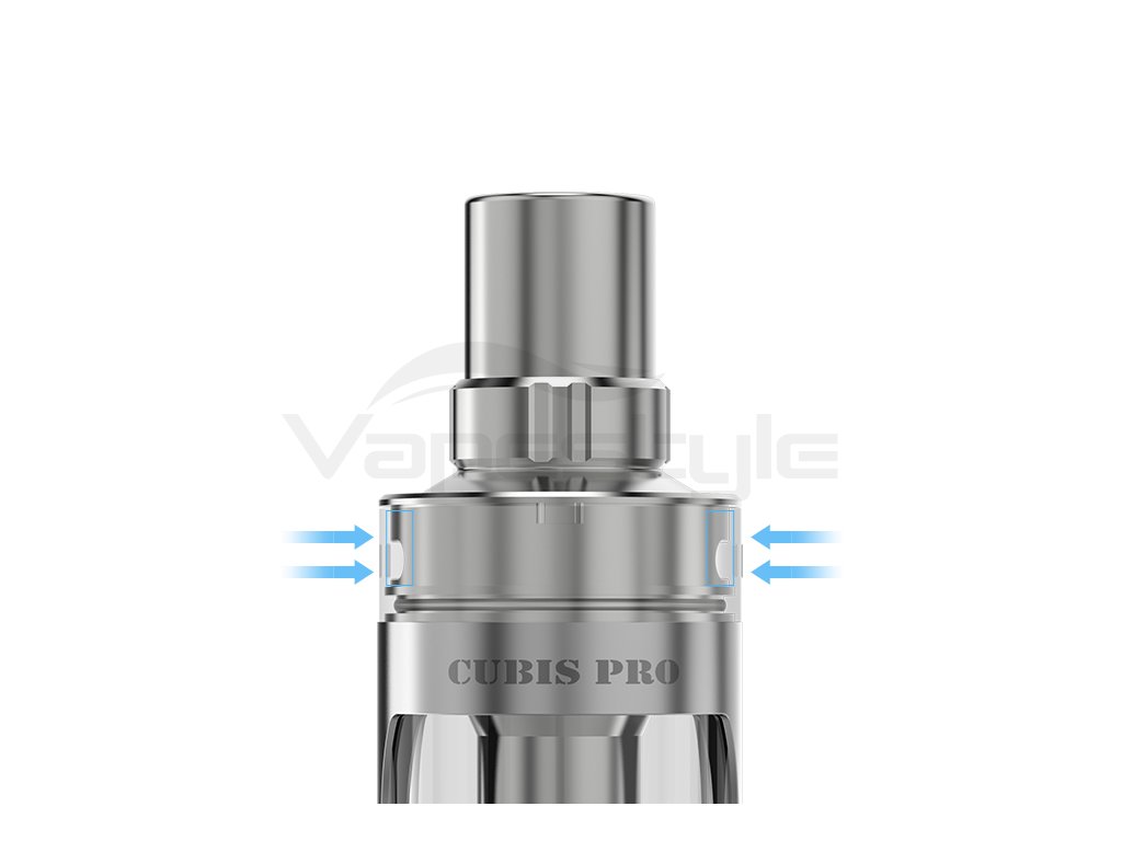 Ve vrchní části se nachází i vylepšený přívod vzduchu pro optimální prožitek z Vapingu. Celý Clearomizer je plně rozebíratelný a vyrobený z nerezové oceli a Pyrexu. CUBIS Pro Vás překvapí novými atomizery LVC Clapton (úprava přívodu liquidu ke spirálce) a QCS (snadná výměna bavlny při zachování nerezové trubičky s vyfrézovanými otvory (Notchcoil). Opět se můžeme spolehnout i na atomizery řady BF, BF Clapton, režim VW a BF SS316, který lze využit pro režim nastavování teploty. V balení je přibalen i další náustek, u kterého je vnitřní část spirálovitého tvaru (ochrana proti případnému prskání liquidu do úst).