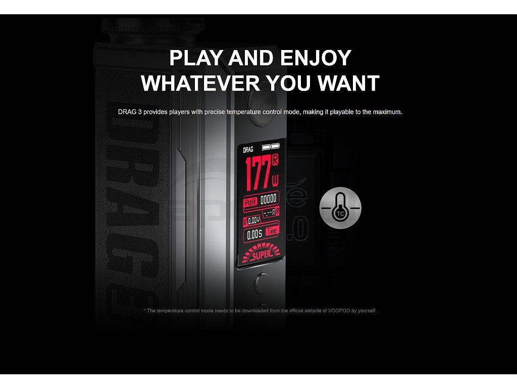 Samotný Grip VooPoo DRAG 3 pohání hned dvě baterie typu 18650 (Nejsou součástí balení). Pokročilý Gene.Fan 2.0 Chip dodává maximální výkon až 177W a celou řadu pokročilých funkcí. Nový chip přináší také bleskurychlé žhavení, a to za rovných 0,001s, kontinuální stabilní výkon a inteligentní režim SMART, který podle odporu použité žhavící hlavy nastaví správný výkon. Tuto funkci ocení především začínající uživatelé, ale i pokročilejší vapeři, kteří nechtějí ztrácet čas složitějším nastavováním. Zcela nový režim SUPER pak dodá okamžitý boost, což zajistí obrovskou produkci páry kdykoliv si budete přát. RBA režim je pak zkratkou pro klasický VW režim s možností nastavení výkonu v rozmezí neskutečných 5 - 177W. Pro opravdové profesionály je pak možné nainstalovat také režim TC (Temperature Control), který můžete získat aktualizací firmware, která je k dispozici na stránkách výrobce VooPoo. Tyto všechny funkce a nastavení zobrazuje velmi přehledný a velký 1,8" palcový TFT displej, který dominuje celému zařízení. K ovládání všech funkcí i samotnému žhavení slouží tři ovládací tlačítka, které jsou umístěny na čelním panelu nad i pod displejem.