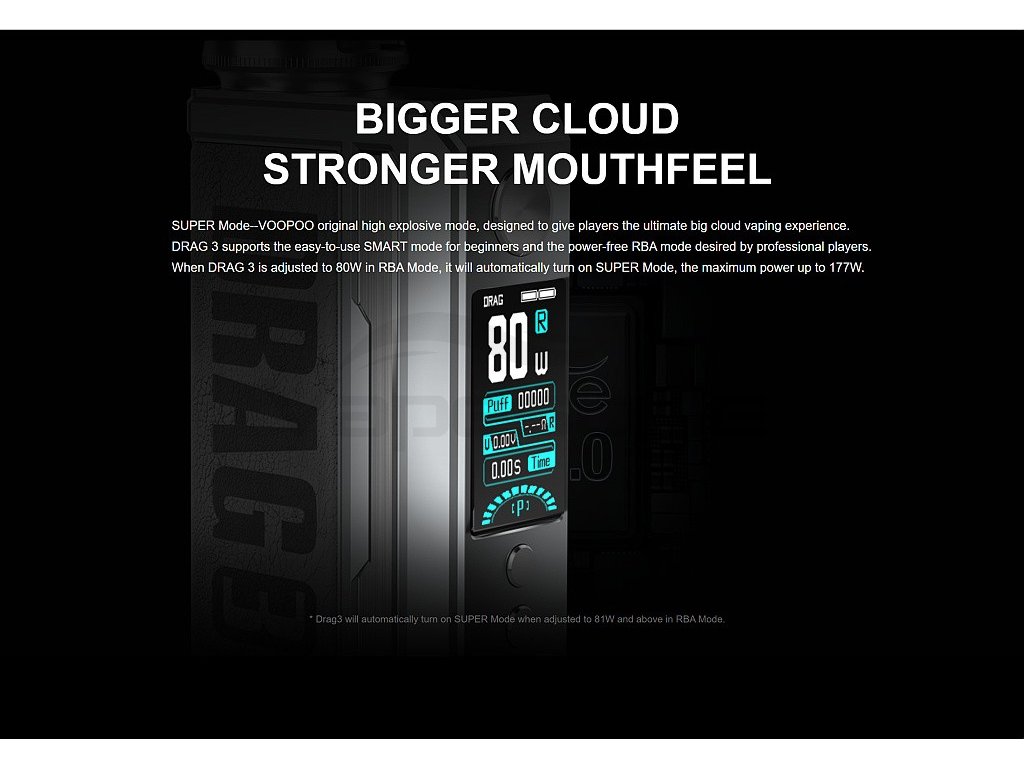 Samotný Grip VooPoo DRAG 3 pohání hned dvě baterie typu 18650 (Nejsou součástí balení). Pokročilý Gene.Fan 2.0 Chip dodává maximální výkon až 177W a celou řadu pokročilých funkcí. Nový chip přináší také bleskurychlé žhavení, a to za rovných 0,001s, kontinuální stabilní výkon a inteligentní režim SMART, který podle odporu použité žhavící hlavy nastaví správný výkon. Tuto funkci ocení především začínající uživatelé, ale i pokročilejší vapeři, kteří nechtějí ztrácet čas složitějším nastavováním. Zcela nový režim SUPER pak dodá okamžitý boost, což zajistí obrovskou produkci páry kdykoliv si budete přát. RBA režim je pak zkratkou pro klasický VW režim s možností nastavení výkonu v rozmezí neskutečných 5 - 177W. Pro opravdové profesionály je pak možné nainstalovat také režim TC (Temperature Control), který můžete získat aktualizací firmware, která je k dispozici na stránkách výrobce VooPoo. Tyto všechny funkce a nastavení zobrazuje velmi přehledný a velký 1,8" palcový TFT displej, který dominuje celému zařízení. K ovládání všech funkcí i samotnému žhavení slouží tři ovládací tlačítka, které jsou umístěny na čelním panelu nad i pod displejem.
