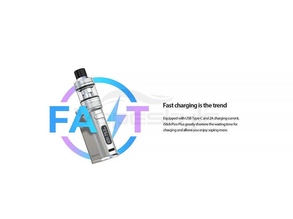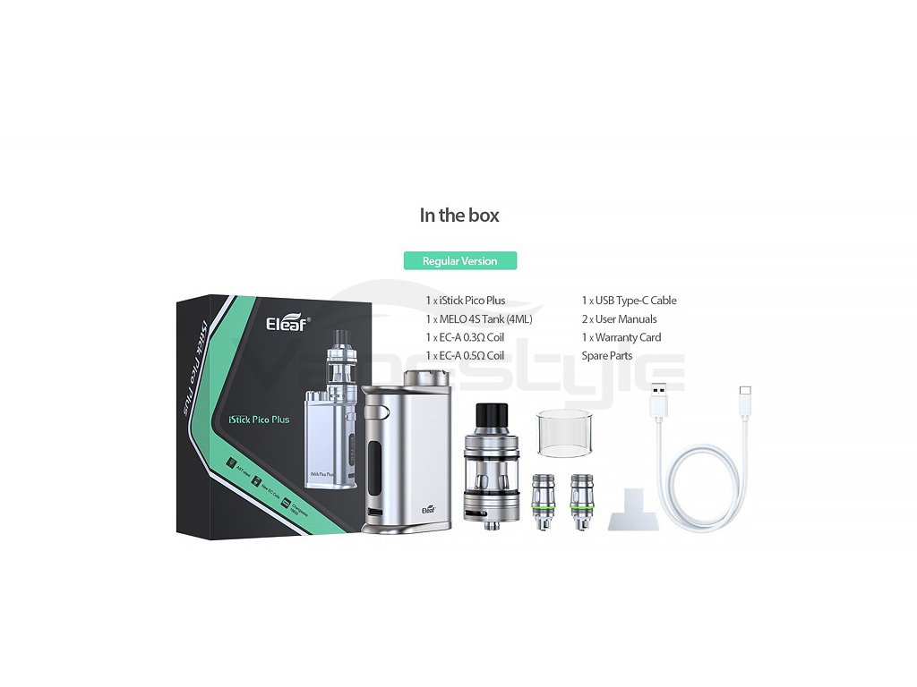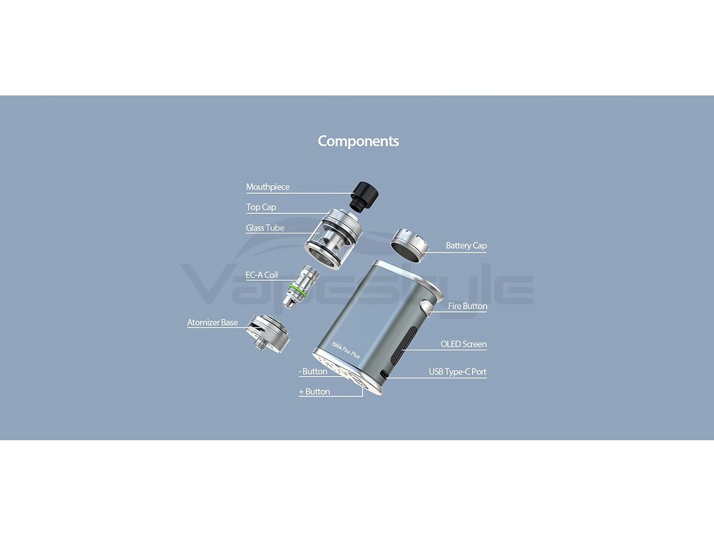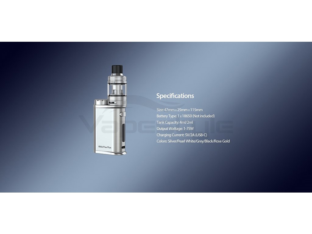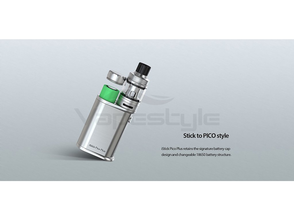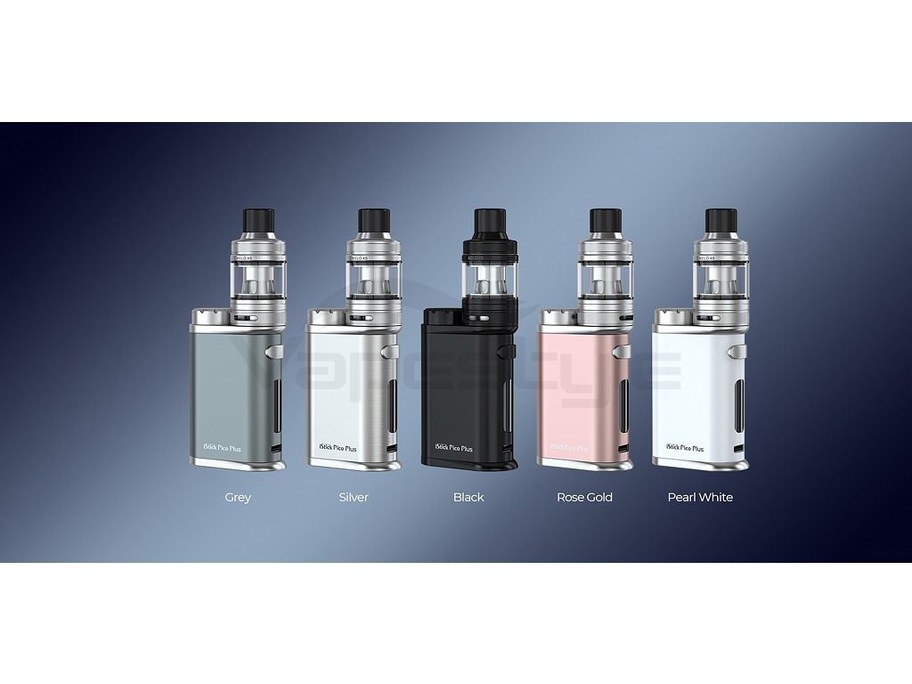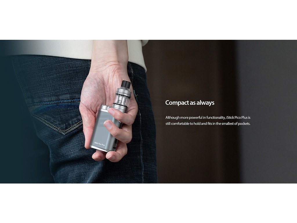 Nástupce oblíbeného iStick Pico, tentokrát s přívlastkem Plus. Vysoký nastavitelný výkon až 75W, na baterie typu 18650, rychlé USB-C nabíjení, OLED displej, Grip je osazen inovativním Clearomizérem Eleaf mělo 4S s kapacitou 4ml, horním plněním, plynulou regulaci Airflow. Zcela nové žhavící hlavy Eleaf EC-A z nerezové oceli AST, které jsou kompatibilní s řadou EC. 2x žhavící hlava EC-A v SETU, závit 510. Baterie nejsou součástí balení. Barevné provedení Silver.