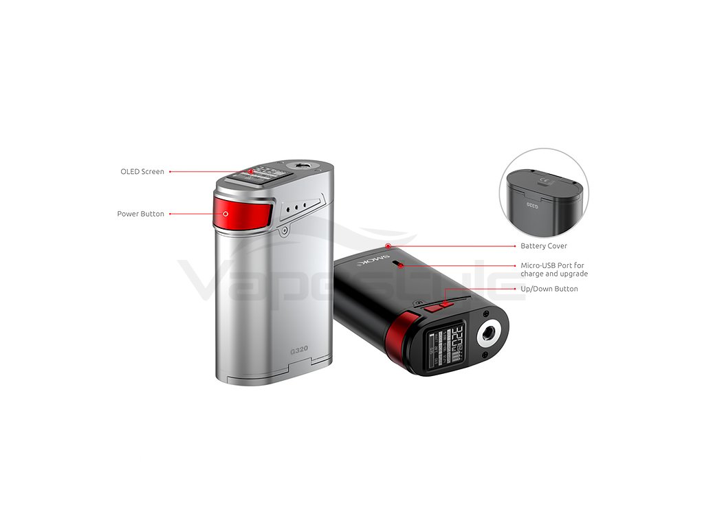Smoktech G320 Marshal patří mezi menší přístroje pro vaping, ale svým výkonem až 320W se z něj stal bezkonkurenční vítěz mezi vysokovýkonnými gripy. I přes svůj malý rozměr (89,5mm x 61,5mm x 31mm) využívá tři monočlánky typu 18650 (min. 25A), avšak lze použít monočlánky pouze dva, a to s maximálním výkonem až 220W. Vedle klasického VW režimu Marshal disponuje i teplotními mody TC-Ni/Ti/SS a TCR. V horní části je velký OLED displej, který Vás informuje o aktuálním výkonu, teplotě, napětí, odporu, proudu, režimu, počtu potahování a kapacitě baterie bez jakéhokoliv přepínání. Nabíjení umožňuje micro USB vstup.