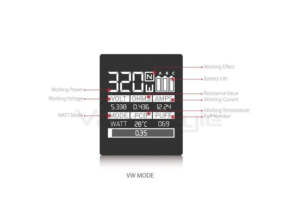 Displej: Zobrazení stavu nabití, odporu atomizeru, aktuální výkon, teplota, napětí, režim, počítání počtu potahů