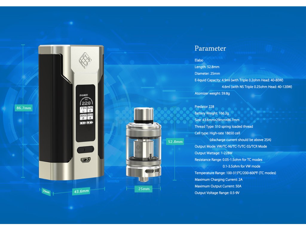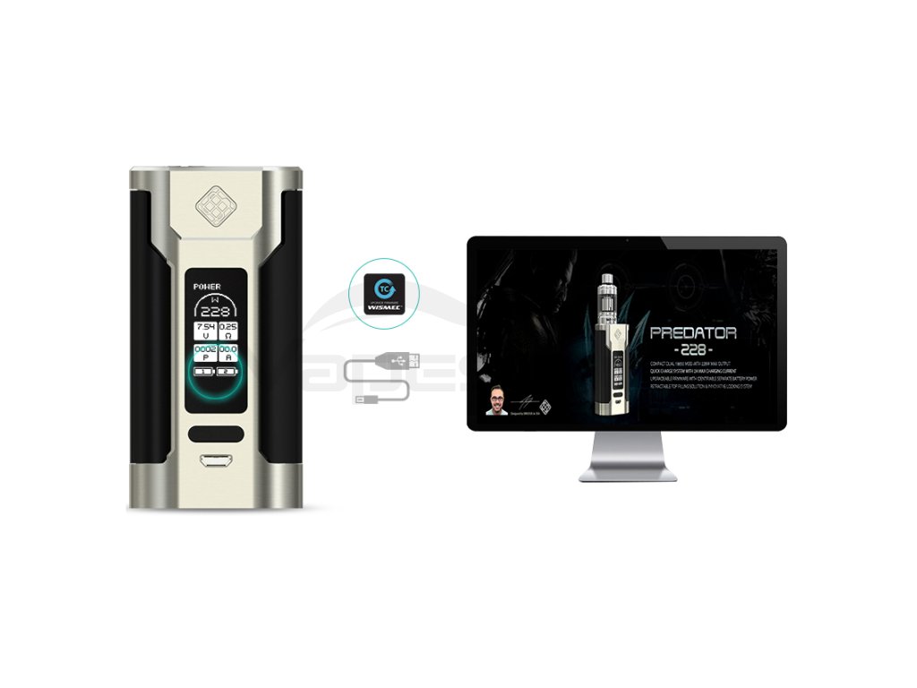 Jako zdroj energie používá Predator oblíbené monočlánky typu 18650 (doporučujeme min. 25A). Aktivační tlačítko je chytře zpracováno do boční strany pro jednoduché ovládání. Wismec Predator 228 disponuje USB Charge modem, který slouží v kombinaci s reverzním (opačným) nabíjecím adaptérem a Gripem jako Power banka.
