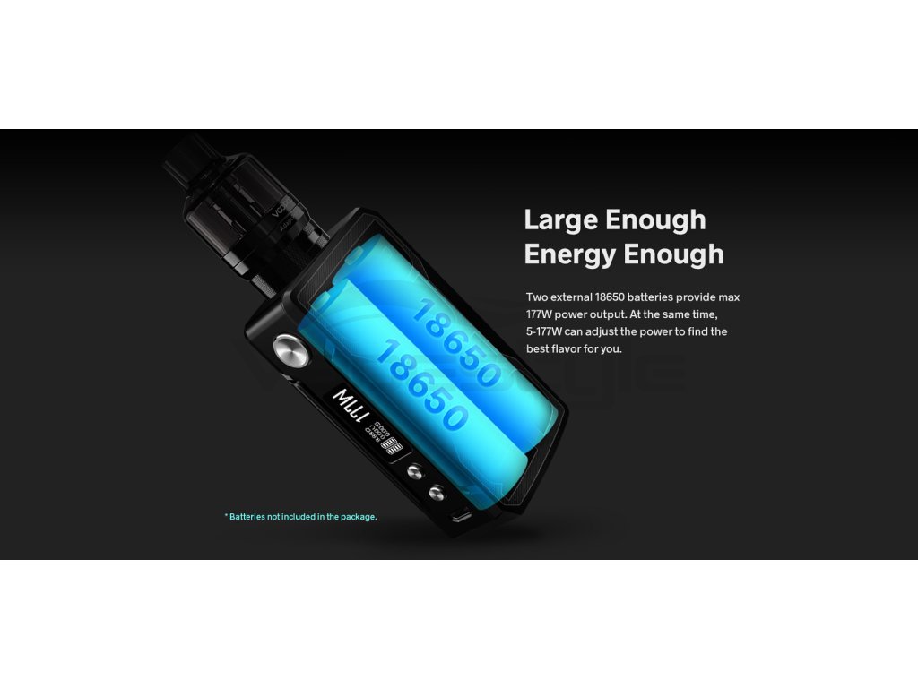 Baterie 18650 Pod druhým bočním panelem, který je k tělu přichycen dvěma silnými magnety, a který na sobě nese velmi estetické logo modelu se ukývá prostor pro hned dvě baterie typu 18650 (nejsou součástí), které jsou zdrojem napětí celého zařízení. |