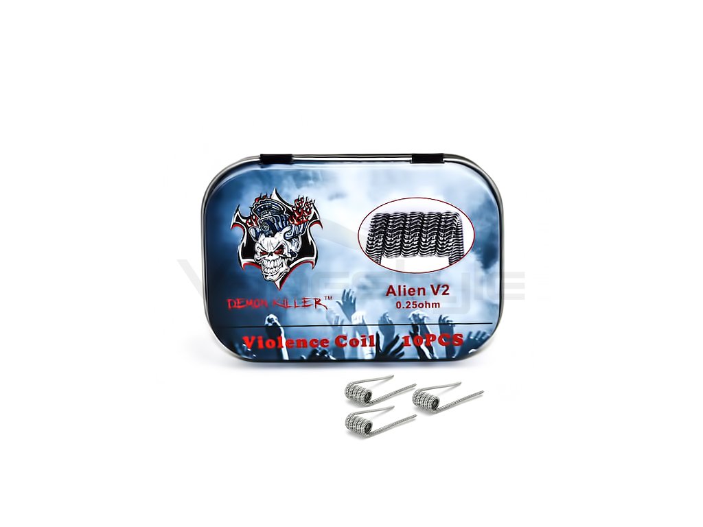 Již hotové předmotané spirálky Kanthal Violence V2 od výrobce Demon Killer, jsou konstrukčně vhodné pro nízkoodporové vapování a cloudchasing, což zaručuje produkci velkého množství páry. Spirálky Alien V2 jsou vyrobeny z odporového drátu Kanthal A1 a nerezové oceli SS316L. Vnitřní průměr omotané spirály je 3 mm. Odpor jedné spirálky je pak 0,25 Ω.