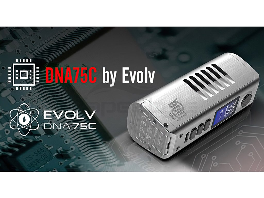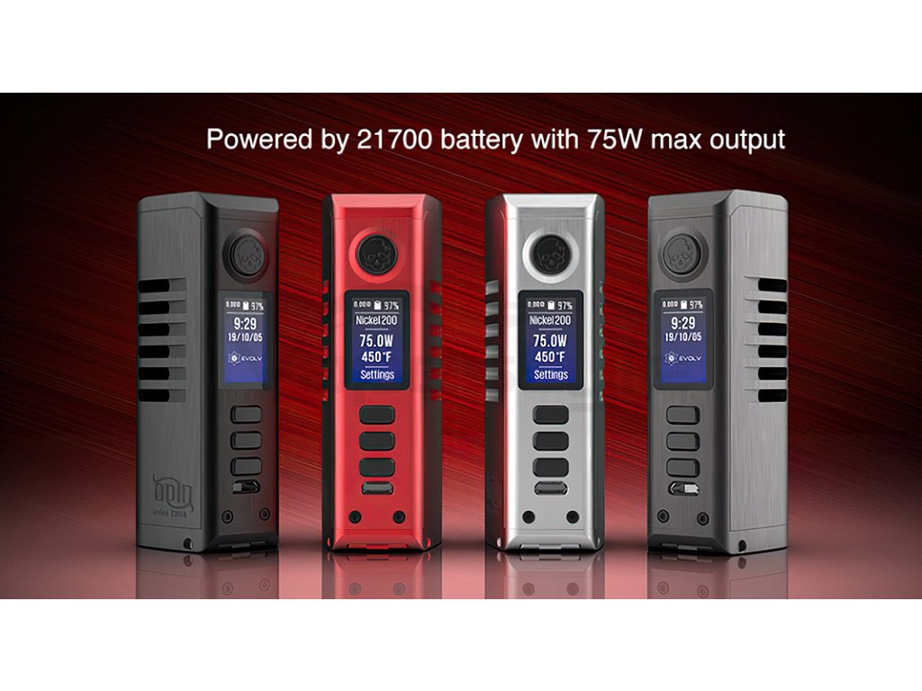 Špičkový Box Mod s DNA čipem Evolv DNA 75C, podpora baterií 18650 a 21700, režimy VW, TC, TCR, Replay. Plná personalizace prostřednictvím volně stažitelného Evolv EScribe software, výkon až 75W, micro-USB nabíjení, závit 510.