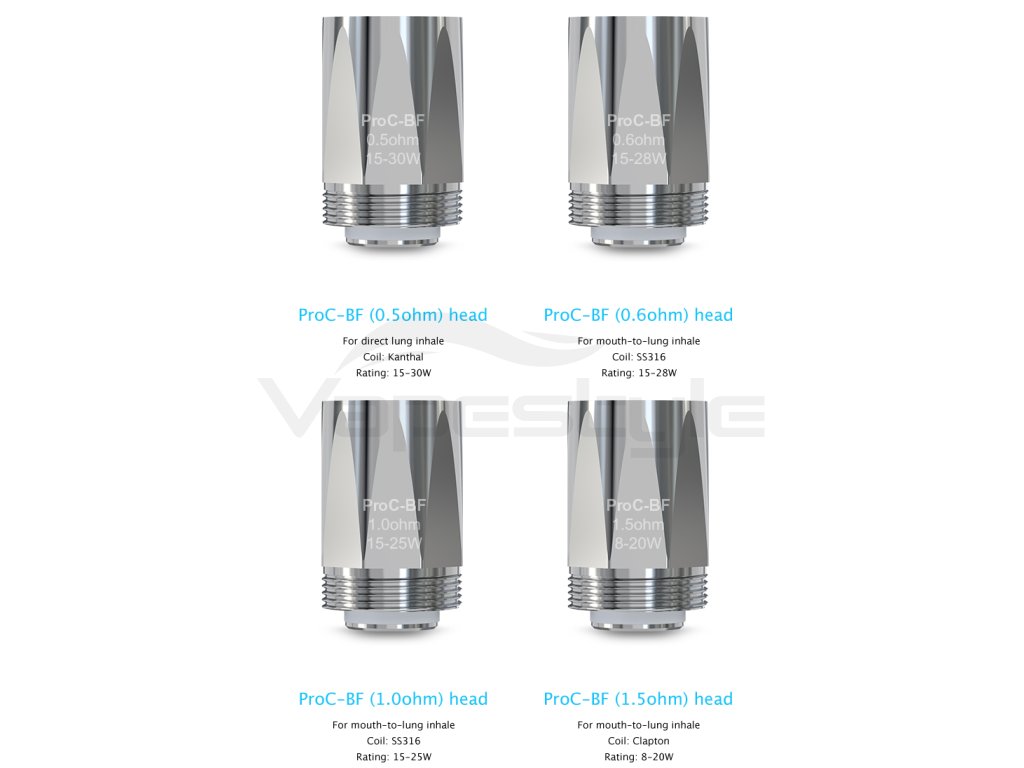 K dostání jsou celkem ve čtyřech verzích, potažmo odporech. Žhavící hlava s odporem 0,5ohm s kanthalovou spirálkou je určena pro dnes velmi oblíbené přímé potahování, naopak žhavící hlavy s odpory 0,6ohm, 1,0ohm a 1,5ohm jsou nejvhodnější pro potahování stylem pusa-plíce (jako u klasických cigaret). Poslední jmenovaná nabízí spirálku Clapton.