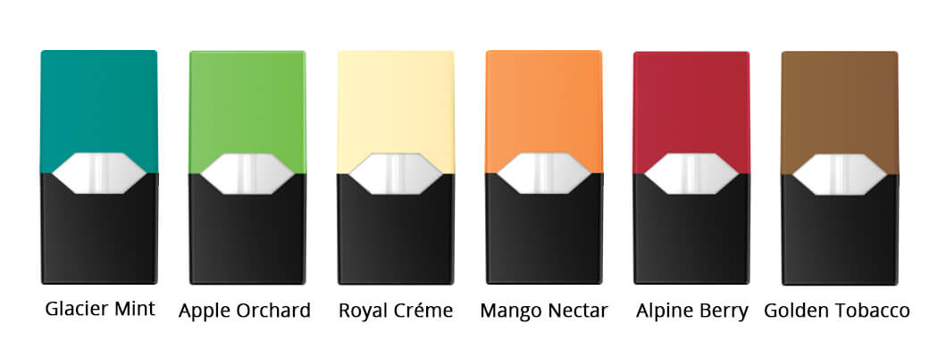 Základní sada obsahuje JUUL Zařízení, USB nabíjecí stanici a čtyři náplně JUUL POD (Golden Tobacco, Glacier Mint, Royal Creme a Mango Nectar).